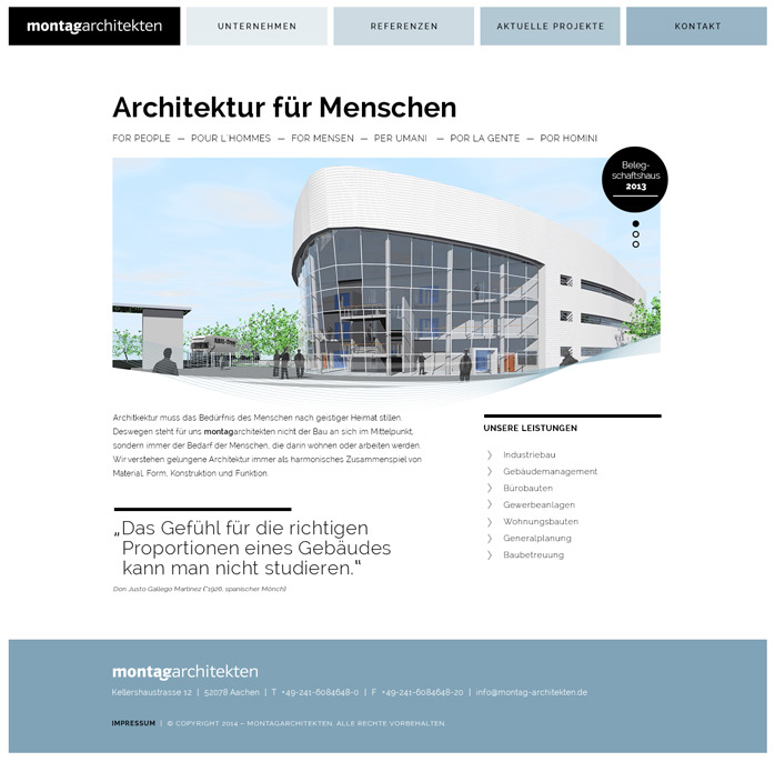 Das moderne Responsive Webdesign bringt die Außendarstellung des Architekturbüros wieder auf den neuesten Stand. [Online-Version wurde nachträglich verändert: www.montag-architekten.de]